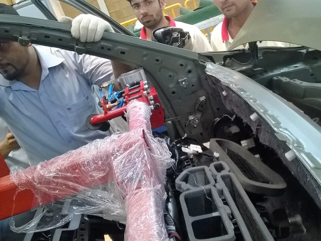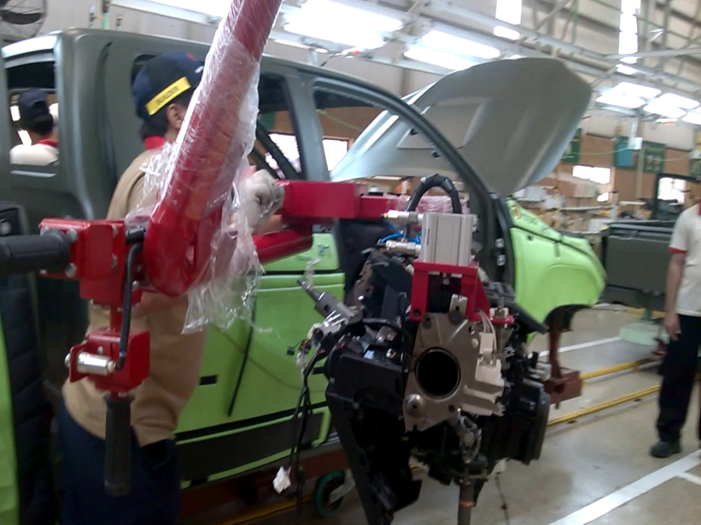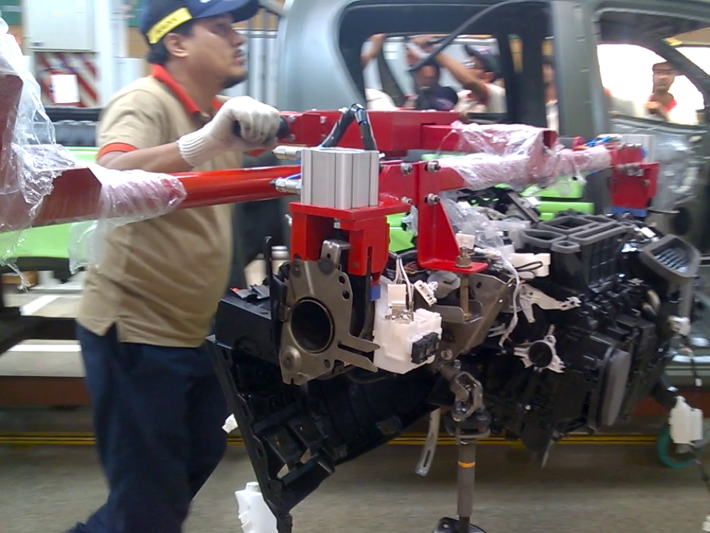 An automotive assembler was looking for a manipulator for their new  SUV assembly line. The purpose was to install the instrument panel weighing 60 kg in their vehicle. We proposed to them our pneumatic manipulator customized for their specific requirements. The manipulator had a range of motions according to all combinations of pick and place locations catering to moving vehicles on the assembly conveyor. The pneumatic manipulator had degrees of freedom namely trolley, shoulder, elbow, vertical, and wrist. The wrist, which incorporated pick & place tooling had an infinite range of rotation for ease of pick & place orientation. The manipulator had been successfully installed and commissioned and actively deployed for the installation of the instrument panels in their SUVs.